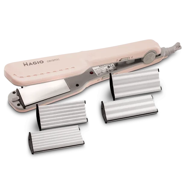 Випрямляч-гофре MG-175P ідеально підходить для швидкого створення красивої зачіски. Вам будуть під силу зачіски будь-якої складності й задумки. Корпус виконаний з приємного на дотик високоякісного пластику, який запобігає плавлення при нагріванні і гарантує тривалий термін служби інструменту. Матеріал поверхні робочих пластин – кераміка, що впливає не тільки на кінцевий результат зачіски, а й на здоров’я волосся. Такий вид пластин завдає найменшої шкоди, швидко і рівномірно нагрівається, легко ковзає по волоссю і запобігає електризації. Випрямляч оснащений подовженими (110 мм) нагрівальними пластинами шириною 25 мм, які дозволяють досягти ідеальних результатів за коротший час. Прилад швидко нагрівається і буде готова до використання менше ніж за 1 хвилину. До комплекту входять три зйомні панелі для випрямлення, великих і маленьких локонів, які професійно і дбайливо забезпечать чудову укладку. Завдяки скороченню кількості рухів під час випрямлення волосся укладання буде займати менше часу. Випрямляч оснащений спеціальним фіксатором, який розташований в підставці приладу. Він фіксує пластини, забезпечуючи зручність зберігання випрямляча і захист від пошкоджень. Петелька для підвішування і шнур, що обмотується на 360° довжиною в 1,7 м створюють додаткову зручність при використанні.